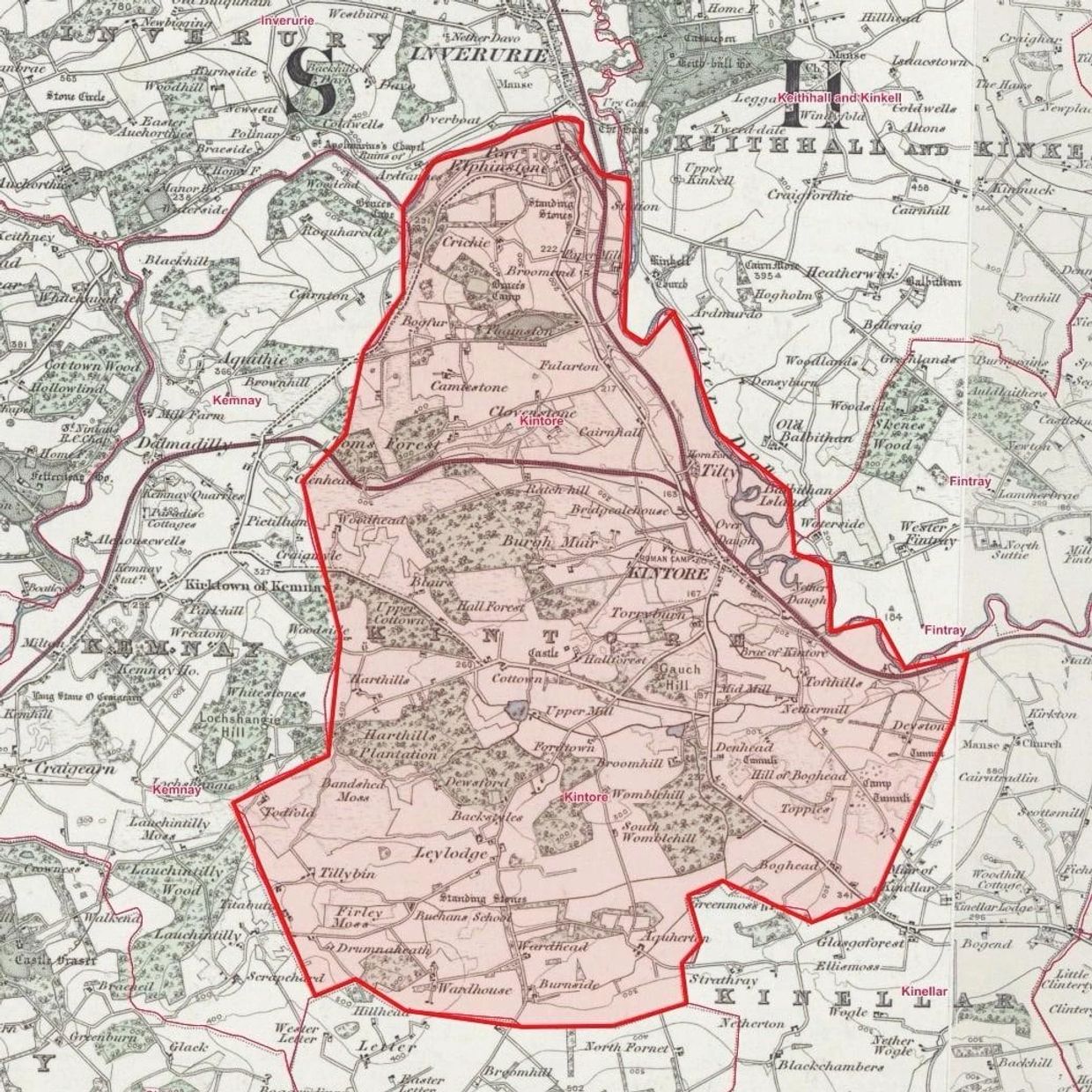 The boundary of the Parish of Kintore was established 300 years ago in 1717. Centred on the Royal Burgh of Kintore itself, the parish covered 37.1 square kilometres (14.3 square miles) from the River Don in the north and east, west beyond Leylodge and south to the boundary with Kinellar.