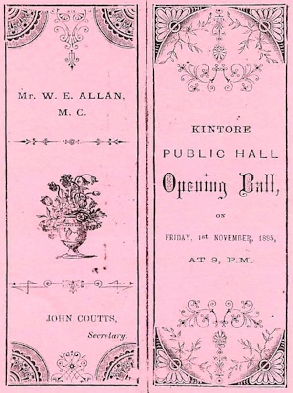 Kintore Public Hall was opened on Friday, November 1, 1895 with an Opening Ball. The programme (below) contained a dance card into which was written the name of the dancing partner for each dance.